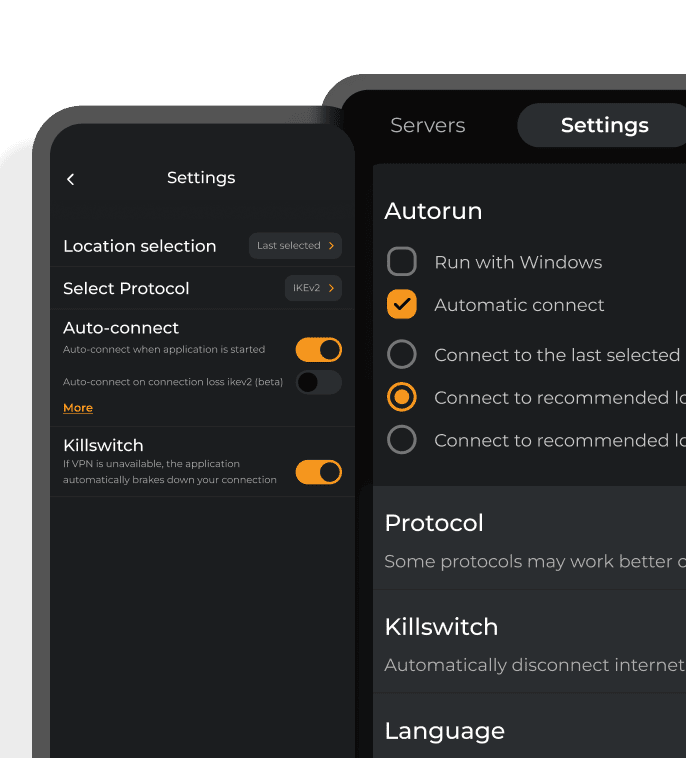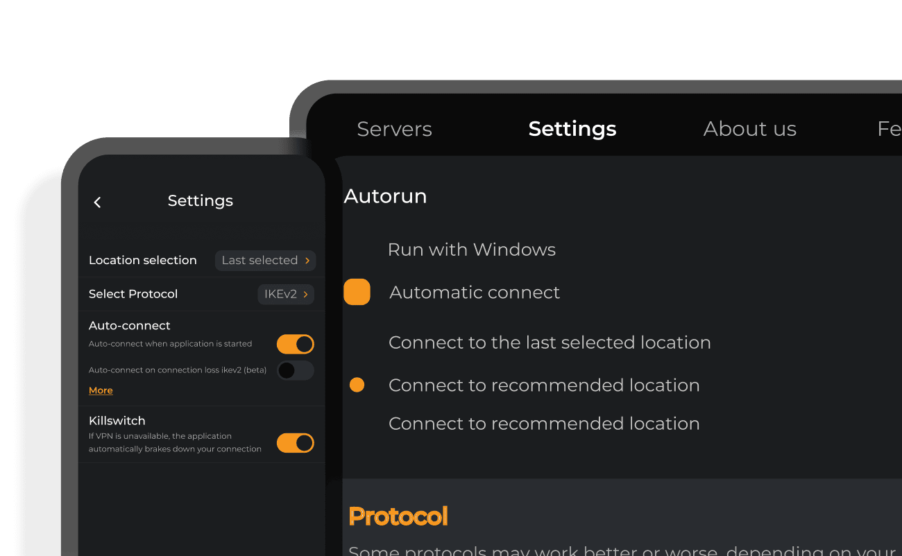 Выбирайте из различных надежных протоколов (OpenVPN, IKEV2, L2TP/IPSec и другие), чтобы найти идеальное сочетание скорости и безопасности с учетом ваших потребностей.